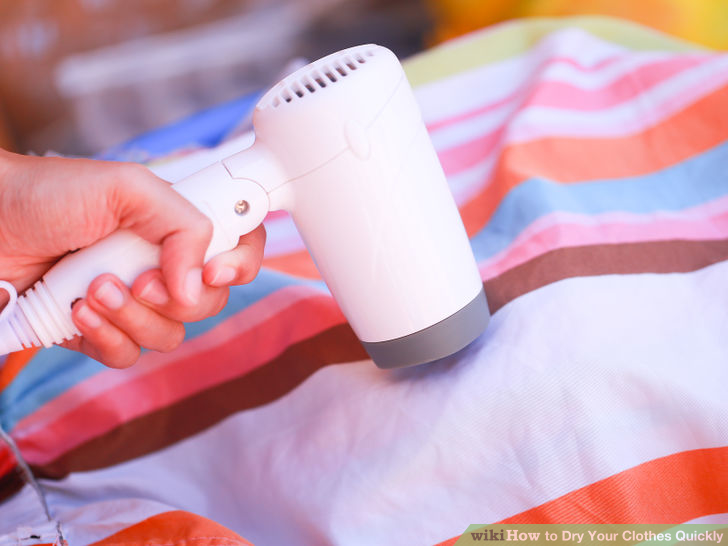 Con el blower Una opción de emergencia para secar la ropa sin secadora es utilizar el blower (secador de pelo). No te recomendamos hacerlo muy a menudo, pues puede acabar por dañar tu ropa, pero si necesitas esa camisa seca en poco tiempo y no tienes otra opción puede sacarte de un apuro.Antes que nada exprime bien la prenda para eliminar el exceso de agua que se haya acumulado, de esta forma acelerarás aún más el proceso de secado. Una vez hayas hecho eso debes estirar la prenda en una superficie plana cercana a una toma de corriente eléctrica.