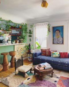 Justina Blakeney  como la encontramos en instagram ha comentado que su residencia la ha convertido en el mejor escaparate de su estilo bohemio y maximalista, con estampados y colores combinados sin miedo y multitud de plantas en cada rincón. Blakeney enseña a menudo sus creaciones en @justinablakey diseñado alfombras, cojines, papeles pintados para decorar las paredes e incluso artículos de papelería, que mezcla en su casa con piezas de Ikea y Target o textiles de segunda mano que encuentra en eBay.